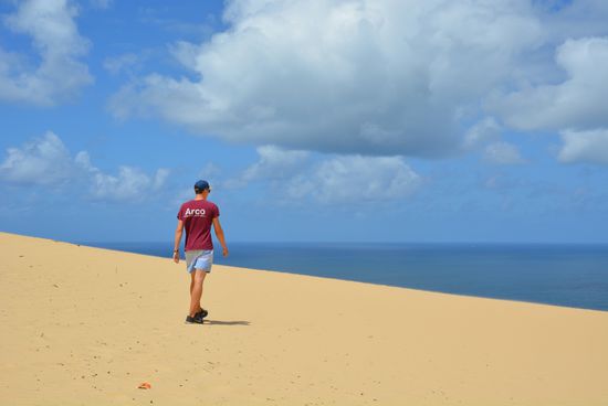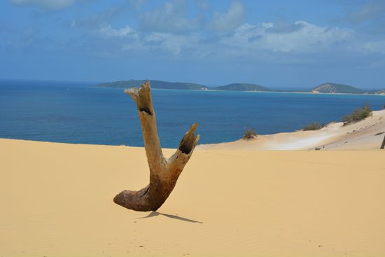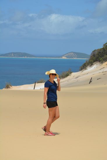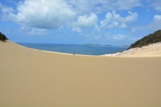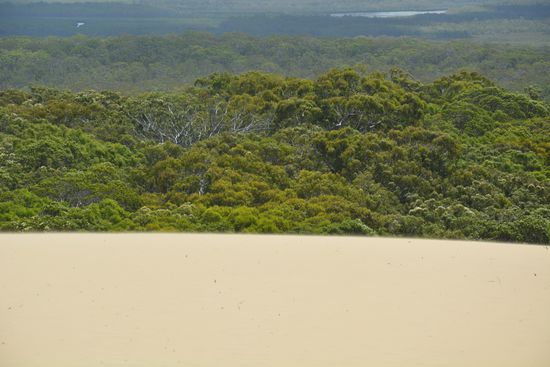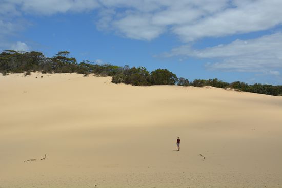 Um etwas mehr Informationen über den Great Sandy National Park zu erfahren gingen wir zur Touri Info. Dort erfuhren wir dass man zum Fahren in der Cooloola Recreation Area (dieser Teil des Great Sandy National Park) ein Permit braucht. Diese und eine Camping Permit für die nächsten zwei Tage kauften wir direkt vor Ort. Danach gingen wir noch einen kurzen Walking Track zur Carlo Sanblow, einer 120m hohen Sanddüne. Die Sanddüne, die sich vom Strand aus in den Wald erstreckt war total faszinierend und definitiv sehenswert. Man hat von dort oben auch einen tollen Blick aufs Meer und ins Hinterland bis nach Tin Can Bay.