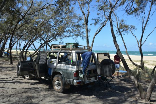 Mitlerweile war nachmittag und wir machten uns auf den Weg zum Inskip Point, an dem auch der Campingplatz für diese Nacht lag. Am Inskip Point kann man mit der Fähre nach Fraser Island rüberfahren. Wir stellten uns nur an den Strand und schauten rüber. Sah genau so aus wie auf unserer Seite . Zumindest aus der Entfernung. Danach testeten wir zum ersten mal den Allradantrieb von Fritz, um über einen Sandweg zu unserem vorher zu Fuß ausgesuchten Stellplatz zu kommen. Dank des Wüstenfahrkurses in Dubai und unserem tollen Auto, meisterte Mo die kurze Strecke mit Bravour . Nun standen wir mit direktem Blick aufs Meer unter schattigen Bäumen fast am Strand. Schöner kann Campen fast nicht sein. Der einzige Nachteil, den wir vorher als Vorteil sahen, war der Wind, der zwar schön kühl war, aber auch viel Sand und Salz mit sich brachte. Das merkten wir aber erst am späten Abend. Wir genossen den nachmittag in der Hängematte und dann auch eine angenehm kühle, weil windige Nacht.