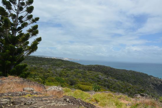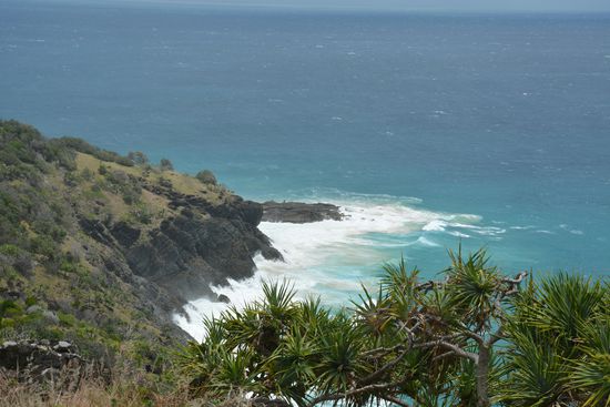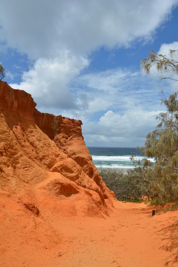 Nach ungefähr 20min. Fahrt erreichten wir den Parkbereich unterhalb des Double Island Point. Weiter ging es zu Fuß den etwas mehr als 1km langen Weg die Klippen hinauf. Beim Ziel angekommen, standen wir neben dem Leuchtturm und genossen die Aussicht auf die Klippen, die Rainbow Beach ihren Namen gaben und das raue Meer mit seinen vielen verschiedenen Blautönen.