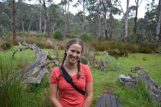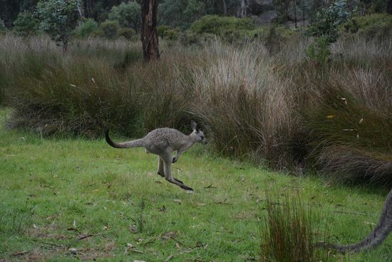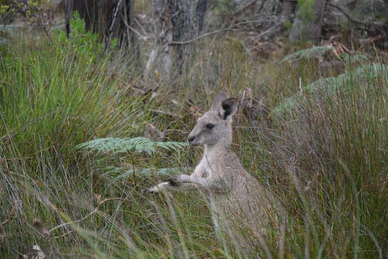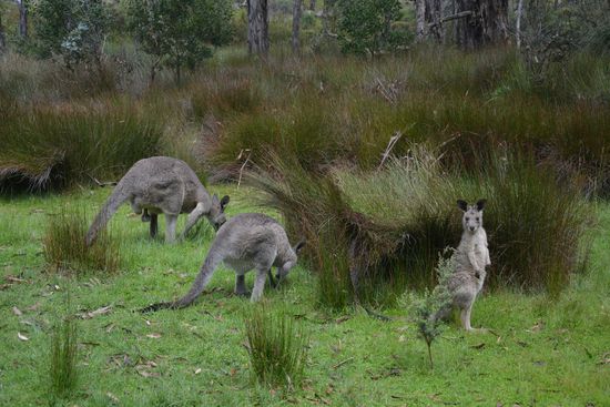 Das größte war ein Männchen und ca. 1.50m groß. Es gab auch noch ein kleines, ganz strubbeliges was aber schon alleine herumhüpfen konnte. Alle waren gräulich und sahen von dem Regen etwas zerzaust aus. Auf der anschließenden Fahrt zum New England National Park, wo wir auf dem Thungutti Campingplatz übernachteten, sahen wir sehr viele Papageien, zwei Kaninchen und noch mehr Kängurus .