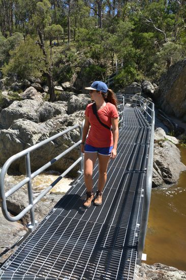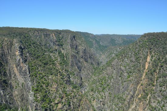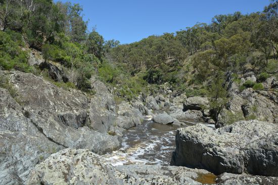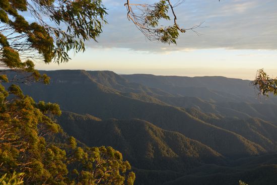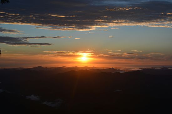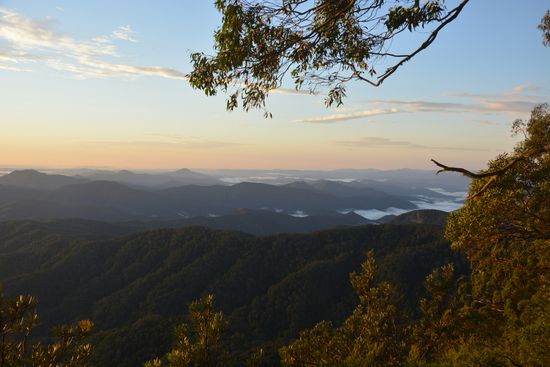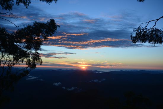 Der Wecker klingelt...es ist 5.45 Uhr und so schön kalt, dass ich am liebsten in die Bettdecke gekuschelt weiterschlafen will. Da wir uns aber den Sonnenaufgang anschauen wollen und Mo zum Glück den Willen hat, aufzustehen, stehe ich auch auf. Wir sind im New England National Park und fahren, nachdem wir schnell warme Klamotten über den Schlafanzug gestreift und das Auto fahrbereit gemacht haben, zum Point Lookout. Vom Parkplatz aus sind es zum Glück nur 200m zum Lookout. Wir kamen, obwohl wir die Zeit des Sonnenaufgangs mangels Handyempfang schätzen mussten, relativ zum richtigen Zeitpunkt . Die Sonne war noch nicht da, aber der Himmel färbte sich rot und in den Tälern vor uns lagen die Wolken. Am Horizont konnte man das Meer erahnen und obwohl die Sonne hinter einer Wolkenschicht und nicht über dem Meer aufging, hatten wir eine sagenhafte Aussicht. Es war ziemlich windig und kalt und auch, nachdem die Sonne da war, wurde es nicht wärmer. Wir fuhren zum Frühstück zurück zum Campingplatz, da es aber erst 7 Uhr war, legten wir uns erst nochmal ins warme Bett . Nach einem verhältnismäßig späten Frühstück fuhren wir in den Oxley Wild River NP. Dort sind die Wollomombi Falls, die in eine große Schlucht stürzen, die recht unerwartet das flache Grasland drumherum teilt. In der Schlucht treffen sich zwei Flüsse und bei einem 4km Walking Track liefen wir erst über den einen und dann zum anderen Fluss, immer oberhalb des Steilhanges. Die Flüsse waren beide unappetitlich braun, aber trotzdem beeindruckend, wie sie sich ihren Weg durch die Schlucht bahnen. Auf dem Weg sahen wir eine Art Igel. Er hatte dicke, recht lange Stacheln und eine schnabelartige Schnauze und ließ sich von uns nicht in seinem Tun stören. Nach dem Walk kochten wir in der Picnic Area unser Mittagessen und überlegten, wo wir abends schlafen wollen. Wir wollten möglichst wieder kostenlos campen und so durchforschten wir WikiCamps Australia, eine tolle App, die viele Campingplätze und auch Parks, Rest Areas und interessante Sehenswürdigkeiten anzeigt und die wir schon seit Beginn der Tour benutzen, um Campingplätze zu finden. Wir fanden einen kostenlosen Platz, der auf dem Weg lag und nach einem kurzen Einkauf in Armidale fuhren wir zur Uralla Fossicking Area, die an einem Fluss und in einem lichten Eukalyptuswald liegt. Wir waren nicht die einzigen Camper und im Fluss spielten ein paar Kinder. Den ganzen Tag lang war strahlend blauer Himmel aber jetzt zogen natürlich dichte Wolken heran und es fing an zu donnern. Da wir diesmal keinen Unterstand hatten, spannten wir eine Plane über die Hecktüren, um nicht komplett im Auto eingesperrt zu sein und damit wir uns zumindest auf unseren Stühlen draußen hinsetzen konnten. Wie sich herausstellte, fing es natürlich gar nicht an zu regnen . Später tröpfelte es dann doch und wir stellten fest, dass die Knie nass werden, wenn man unter der Plane sitzt. Die Konstruktion muss also noch überarbeitet werden .