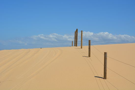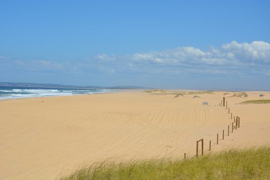 Wie sonst auch ließen wir uns von Google navigieren, was sonst auch immer ganz gut funktioniert, aber dieses mal war irgendwie der Wurm drin. Die eigentliche Abfahrt, die uns direkt vom Highway in die Nähe von Tin City gebracht hätte, gehört mitlerweile den Aboriginies und ist für Besucher geschlossen. Jetzt ist die einzige Möglichkeit dorthin zu kommen über den Strand, entweder von Anna Bay im Norden oder der Lavis Lane in Williamstown im Süden. Der Nähere Eingang ist von der Lavis Lane, von wo aus man ungefähr 7Km am Strand fahren muss, bevor man Tin City erreicht. Da wir es aber vermeiden wollten am Strand zu fahren, um Fritz danach nicht wieder waschen zu müssen, machten wir uns auf die Suche nach anderen Wegen, wurden aber nicht fündig. Von einem etwa 2km entfernten Parkplatz liefen wir dann aber doch einmal zum Strand, da wir zumindest die besonders großen und langen Dünen von Stocktown Beach sehen wollten. Natürlich hatten wir uns auch nicht eingecremt und hatten auch kein Wasser dabei, so dass wir ziemlich fertig, nach ca. 6km laufen am Strand, wieder beim Auto ankamen. Allerdings war der Strand wirklich sehenswert, sodass wir wenigstens nicht umsonst fertig waren . Außerdem wollten wir uns am selben Strand noch ein Wrack ansehen, bei dem wir aber ein ähnliches Problem hatten. Die Zufahrtsstraße, die wir gesucht haben, wurde wegen einem Neubaugebiet geändert und natürlich wurde nichts ausgeschildert...