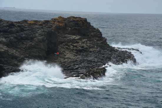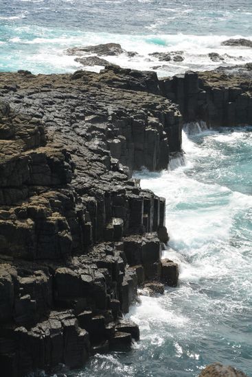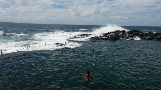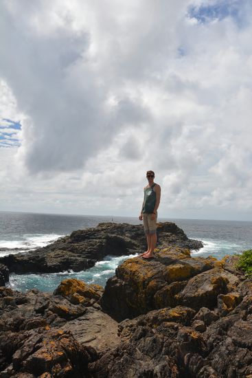 Nachdem wir in Jamberoo ausgeschlafen hatten, fuhren wir nach Kiama und dort zum Leuchtturm. Hinter dem Leuchtturm ragt eine felsige Landzunge ins Meer hinaus. Hier befindet sich das Kiama Blowhole. Das Blowhole ist ein unterirdischer Gang, der vom Meer in die Felsen gespült wurde und der an einer Stelle von oben eingebrochen ist. Wenn der Wind jetzt von der richtigen Seite kommt und die Wellen in den Gang hineintreibt, spritzt das Wasser aus der eingebrochenen Stelle hoch in die Luft. Wir hatten Glück in konnten beobachten wie das Wasser mit einem lauten Whooomb erst gegen die Felsen prallte und dann bis zu 6m hoch in die Luft spritzte . Danach kletterten wir noch etwas auf der Landzunge herum. Der Stein ist vulkanischen Ursprungs und war an manchen Stellen geformt wie fünfeckige Säulen. Das Wasser hatte eine tolle eisblaue Farbe, wenn es gegen die Felsen gespült wurde. Nachdem wir uns am Blowhole sattgesehen hatten, gingen wir in den nahegelegenen Rockpool, einen Meerwasserpool, der in einem teilweise natürlichen Felsbecken lag, was nur an den Rändern durch Betonwände ergänzt war. Das Wasser war ganz klar und dunkelgrün-türkis. Manchmal kamen hohe Wellen die dann über die Felsen am Rand in die Höhe spritzten und sich in den Pool ergossen. Es war warm und sonnig und das Wasser hatte eine angenehme Temperatur, sodass wir die Abkühlung sehr genossen. Nachdem wir noch am Rockpool geduscht hatten, fuhren wir zu einer Wäscherei, da unser Wäschesack mal wieder voll war. Während die Waschmaschine lief gingen wir einen Kaffee trinken . Als die Wäsche dann endlich gewaschen und getrocknet war, fuhren wir noch zum kleinen Blowhole, welches zwar nicht so hoch ist, aber angeblich zuverlässiger funktioniert. Davon merkten wir allerdings nichts, denn als wir da waren funtkionierte es gar nicht . Zum schlafen fuhren wir wieder auf den gleichen Stellplatz wie zuvor, da schon wieder Regenwolken aufzogen und wir noch im trocknen ankommen wollten. Da der Platz schon recht voll war, fuhren wir erstmal in eine Lücke, um zu überlegen wo genau wir parken wollen. Kaum hatten wir den Motor ausgemacht als die Besitzerin des danebenstehenden Wohnwagens eine abfällige Bemerkung über uns machte, weil wir etwas nah am fensterlosen Hinterteil ihres Wohnwagens standen. Kurze Zeit später kam dann ihr Mann und sagte uns, dass er so nicht ausparken könne und wir deswegen weiter weg sollten. Da auf der anderen Seite von uns ein sehr netter Camper stand, der sein Auto umparkte damit wir uns gescheit und mit gebührendem Abstand hinstellen konnten, war das dann kein Problem. Natürlich fuhren die unfreundlichen Camper am nächsten morgen nicht weg, sodass wir auch da hätten stehen bleiben können, wo wir vorher standen...Beim Kochen fing es dann an zu regnen und der nette Camper schenkte uns seinen alten aber sehr großen Regenschirm . Wir waren sehr dankbar und stellten belustigt fest, dass wir wohl an der Grenze zwischen Gut und Böse eingeparkt hatten .