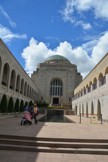 Die Aussicht aus dem ersten Stock des Parlamentes. Wenn man durch das obere Fenster in der Fassade schaut, sieht man wieder die Verbindung zum War Memorial.