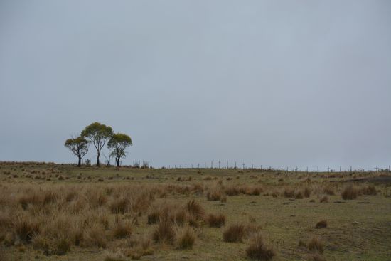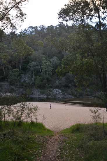 Am nächsten Morgen regnete es immer noch. Eigentlich hatten wir vor, uns die Snowy Mountains anzusehen, aber da kein Ende des Regens abzusehen war und der Wetterbericht für den nächsten Tag keine Besserung versprach, beschlossen wir so weit wie möglich in den Süden zu fahren. Der Regen ging uns ziemlich auf die Nerven. Nicht nur weil man dann nicht wirklich etwas machen kann, sondern auch weil dann alles im Auto nass wird, sobald man die Hecktür öffnet Auf unserem Weg durch die Gras und Heidelandschaft der Hochebene regnete es fast durchgehend. Auf unserer Flucht vor dem Regen kamen wir bis nach Orbost, was am Küstenhighway liegt, wo wir uns einen netten Campingplatz an einem Fluss suchten. Der Weg zum Campingplatz war steil und kurvig und wir waren froh, dass wir mit Allrad unterwegs waren, denn bei Regen (Es regnete übrigens seit Orbost nicht mehr ) könnte das sonst schwierig werden. Allerdings wurden wir durch einen tollen Platz direkt am Snowy River für die hoppelige Anfahrt belohnt. Der Fluss war ganz flach und klar und hatte einen breiten Sandstrand, den wir dann noch für einen Strandspaziergang nutzten . Da wir fest davon überzeugt waren, dass die Regenpause nicht lange anhalten könne, spannten wir hinter dem Auto das erste mal unsere große Plane auf, die wir an zwei Bäumen befestigten. Natürlich regnete es dann doch nicht, was uns aber sehr freute, denn so hatten wir wenigstens das schlechte Wetter vorerst hinter uns gelassen .