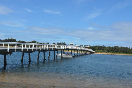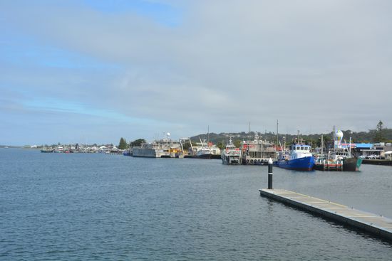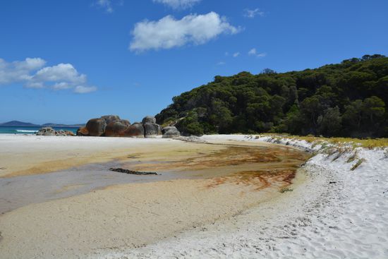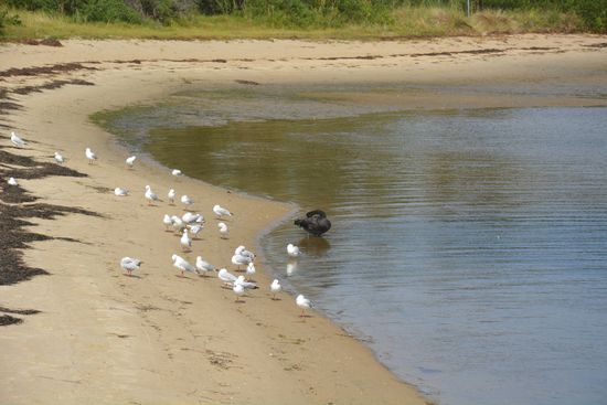 Bei schönem Wetter verließen wir unseren Standplatz bei Orbost und fuhren Richtung Lakes Enterance. Auf dem Weg dorthin fing es wieder an zu regnen...In Lakes Enterance regnete es nicht und so schlenderten wir kurz über den gerade stattfindenden Markt. Danach spazierten wir über die Fußgängerbrücke auf die Landzunge, die die Seen vom Meer trennt und gingen an den Strand. Da am Himmel aber schon wieder dunkle Wolken aufzogen, hielten wir uns nicht lange auf und suchten uns zum Mittagessen ein ruhiges Plätzchen an einem der Seen. Den Nachmittag verbrachten wir im Auto, um unserem nächsten größeren Ziel, dem Wilsons Promontory National Park etwas näher zu kommen. Wir fuhren noch etwa 210km und hielten für die Nacht auf der Franklin River Rest Area, die ein guter Ausgangspunkt ist, um in den Nationalpark zu fahren. Die Rest Area bestand aus einer großen Grünfläche mit vielen Bäumen und war dementsprechend gut besucht. Auf unserem Weg dorthin sahen wir leider einige tote Wombats .
