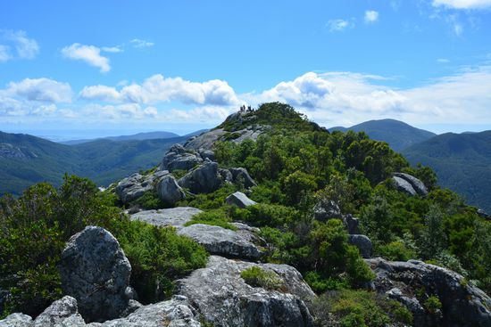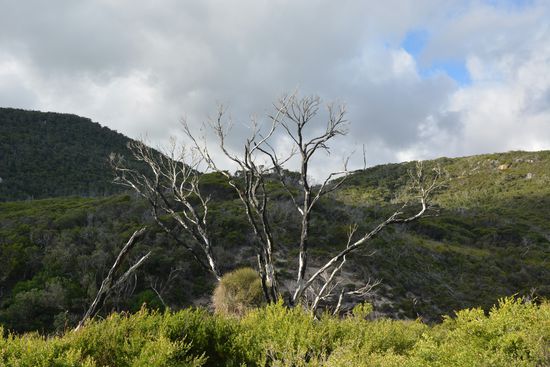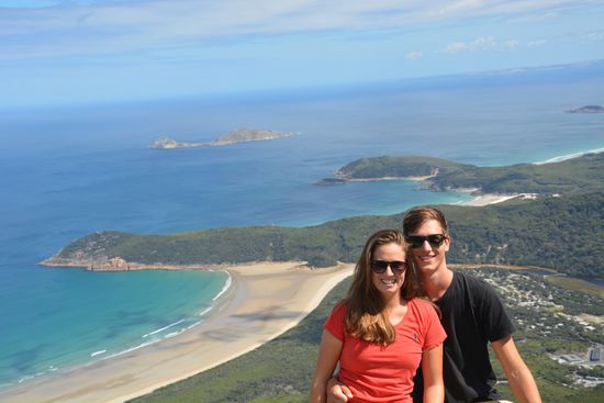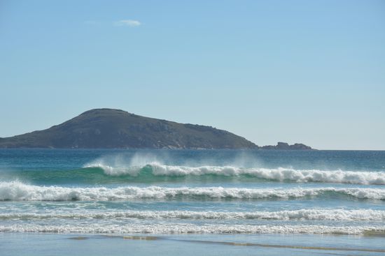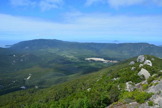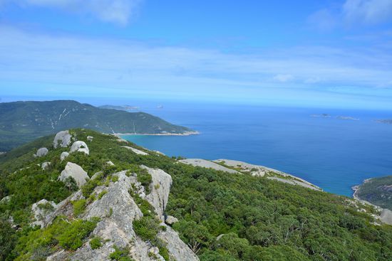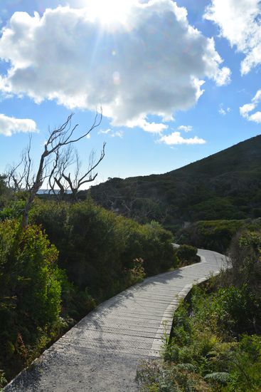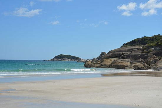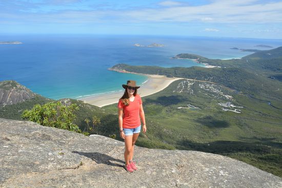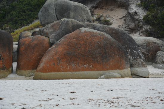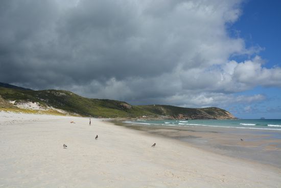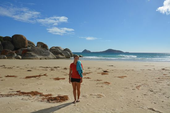 Heute fuhren wir in den Wilsons Promontory NP. Der Nationalpark liegt auf einer sehr großen Halbinsel und stellte vor langer Zeit einmal die Landbrücke nach Tasmanien dar. Der südlichste Punkt des australischen Festlandes befindet sich dort im NP. Das Land ist zu Beginn der Halbinsel sehr flach und schmal, aber weiter südlich wird sie breiter vor allem bergiger (bis 700m). Die Vegetation im Nationalpark besteht viel aus Küstennahem Buschland und sah sehr interessant aus, mit vielen toten Bäumen zwischendrin, die von einem verheerenden Buschfeuer in 2009 stammen. Wir fuhren zum Telegraph Saddle Carpark, um von dort aus die 3,5km auf den 558m hohen Mount Oberon zu laufen. Der Weg an sich war recht einfach, da es sich um einen geschotterten Fahrweg zum oben stehenden Funkmast handelte. Nur ganz oben musste man eine schmale, in den Fels geschlagene Treppe erklimmen, um den Gipfel zu erreichen. Oben angekommen bot sich uns eine grandiose Aussicht . Der Gipfel besteht aus einer Felskuppe und so konnten wir, auf der Felsplatte sitzend, die Aussicht auf verschiedene Buchten, die Berge und sogar bis zum "Festland" genießen. Das Wasser in den Buchten war klar und helltürkis und da gerade Ebbe war und keine Wellen gingen, errinnerte es uns etwas an Thailand . Wir kletterten noch ein Stück auf den Felsen den Gipfel entlang, um auch in die andere Richtung schauen zu können, wo man weitere Berge und eine große Sanddüne sah. Das Wetter war übrigens super, blauer Himmel und ein paar weiße Wolken, die die Aussicht interessanter machten . Nachdem unsere Müsliriegel und Äpfel aufgegessen waren und wir uns an der Aussicht sattgesehen hatten, machten wir uns auf den Rückweg. Am Auto angekommen, merkten wir unsere Beine und waren gespannt, ob wir Muskelkater bekommen würden . Dabei waren es ja nur 7km. Es gibt viele Strände im Nationalpark, aber nur einen, bei dem der Sand quietscht...Mit dem Auto fuhren wir zum Squeaky Beach, dessen schneeweißer Quarzsand beim feste drüber schlurfen lustige Quietschgeräusche von sich gibt. Es war sehr windig, sodass wir nicht ins Wasser gingen, aber wir legten uns zum Sonnen und Lesen trotzdem an den Strand. Irgendwann wurde uns kalt, weil mittlerweile wieder dunkle Wolken aufzogen und wir beschlossen, zum kleinen "Ort" Tidal River im Nationalpark zu fahren, um dort eine kostenlose heiße Dusche zu nehmen und im Visitor Center meine Kamera aufzuladen. Allerdings war das Visitor Center schon geschlossen (um 16.30...) und so gingen wir nur duschen. Der "Ort" besteht aus einem Visitor Center, einem General Store und einem Campingplatz. Da der Campingplatz aber total überteuerte 60$ pro Nacht kostet (ohne Strom...), hatten wir nicht vor dort zu übernachten. Es ist uns ein Rätsel wieso der Platz jeden Sommer komplett ausgebucht ist, bei den Preisen. Wir machten uns also auf den Rückweg zur Franklin River Rest Area und hielten vorher noch am Whiskey Beach, der auch im Nationalpark liegt. Der Strand wird an beiden Enden von großen abgerundeten Felsen umrahmt und war auch sehr schön. Auf dem Heimweg sahen wir noch ein lebendes Wombat am Straßenrand im Gras und hielten hinter drei anderen Autos an, um es näher anzusehen. Als wir zu der Stelle zurückgelaufen waren, war das Wombat aber schon in die Büsche verschwunden. Trotzdem war es ein toller Abschluss eines sehr schönen Tages, jetzt auch ein lebendes Wombat gesehen zu haben, wenn auch nur im vorbeifahren . Das gute Wetter hatte uns richtig gut getan und wir waren am abend so zuversichtlich, dass wir sogar Tisch und Stühle über Nacht draußen stehen ließen .