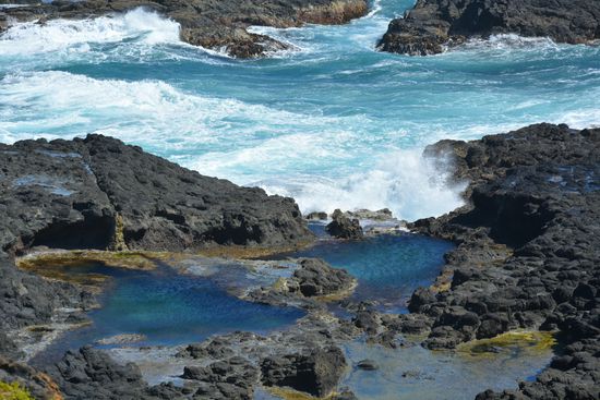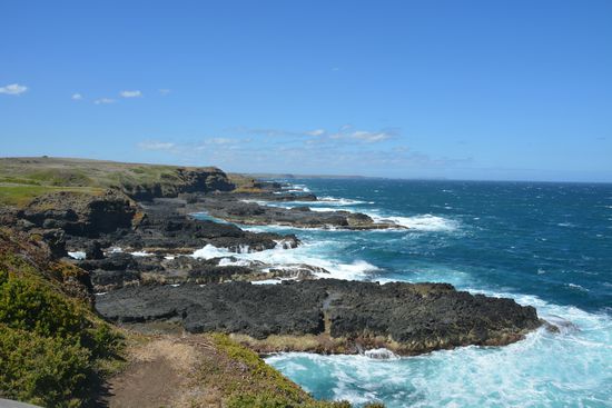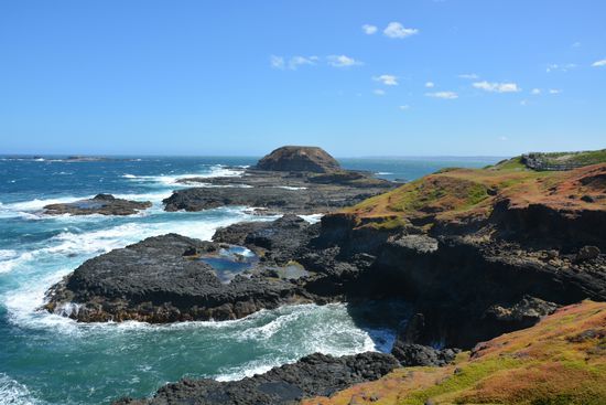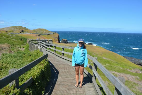 Nach einer regenfreien Nacht und noch trockenen Stühlen, merkten wir am nächsten Morgen, dass wir tatsächlich etwas Muskelkater hatten. Wir frühstückten gemütlich und fuhren dann in Richtung Phillip Island, wo man freilebende Pinguine sehen kann. Auf Phillip Island angekommen, gingen wir zuerst zum Nobbies Center, welches an der westlichsten Spitze der Insel liegt. Etwas mehr als einen Kilometer vor der Küste liegt Seal Rock, eine kleine felsige Insel auf der eine Robben Kolonie lebt, die man vom Nobbies mit Ferngläsern beobachten kann. Das haben wir allerdings nicht versucht, denn wir hatten keine 2$ für die Ferngläser dabei. Stattdessen sind wir den 1,2km langen Boardwalk gegangen. Der Boardwalk führt über bunt bewachsene Klippen, die aussähen als hätte man sie mit Teppich überzogen und auf denen wir am liebsten ein Picknick gemacht hätten, wenn es nicht so windig gewesen wäre. Mit etwas Glück kann man auch Zwergpinguine beobachten, die direkt neben dem Weg ihre Höhlen haben und sich manchmal sonnen. Das war eigentlich auch der Hauptgrund für unseren Besuch. Wir hatten am Tag zuvor etwas recherchiert, wo man Pinguine sehen kann und hatten nur die Pinguin Parade gefunden. Für diese muss man aber min. 25$ zahlen und kann dafür dann von Tribünen aus beobachten, wie die Pinguine während dem Sonnenuntergang zurück zu ihren Höhlen kommen. Auf WikiCamps hatten wir dann aber zum Glück einen Kommentar entdeckt, wo jemand schrieb, dass er beim Nobbies Center Pinguine gesehen hatt. Wir sahen vom Boardwalk aus fünf Pinguine aus nächster Nähe und sie sahen genau wie wir etwas durchgefroren und vom starken Wind zerzaust aus . Vom Nobbies Center fuhren wir am Strand entlang nach Cowes, wobei wir noch einen Zwischenstopp am Strand machten, um nochmal nach Pinguinen zu suchen. Unsere Suche war aber ohne Erfolg. In Cowes wollten wir eigentlich einen Kaffee Trinken, doch natürlich war es schon 16:01 Uhr und deshalb machte, oder hatte schon alles zu... Es ist uns immernoch ein Rätsel warum hier alles schon so früh zumacht. Enttäuscht gingen wir zur Bibliothek, wo wir etwas Strom geschnorrt haben. Während wir darauf warteten, dass der Kameraakku geladen wird, kam plötzlich ein aufgeregtes kleines Mädchen auf uns zu und machte uns auf das Possum aufmerksam, welches direkt hinter uns auf der anderen Seite des Fensters auf einem Baum umher kletterte . Plötzlich waren überall um uns herum kleine Kinder die ganz aufgeregt nach draußen sahen . Ein Possum bei Tageslicht zu sehen ist anscheinend ein Ereignis, welches nicht sehr häufig vorkommt. Nach unserem Abenteuer in der Bücherei fuhren wir wieder aufs Festland und zu einem Stellplatz.