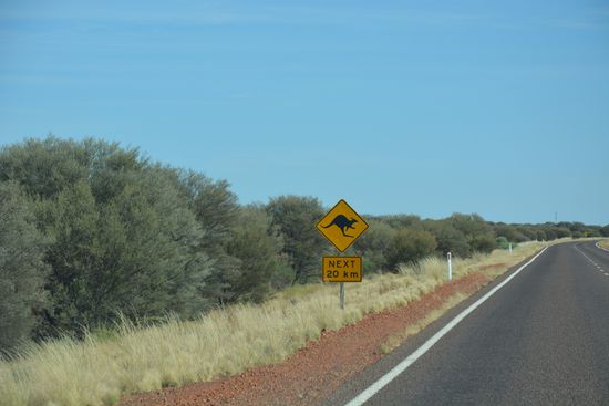 Unsere Reise zum Uluru begannen wir pünktlich mit dem Sonnenaufgang, denn von Coober Pedy nach Yulara (dem Ort beim Uluru) sind es ca.750km. Bei der Fahrt sahen wir Schafe, Pferde und sogar 4 Emus am Straßenrand. Wir machten mehrere Stopps und hielten 2 mal zum Tanken an, wobei wir feststellten, dass Benzin immer teurer wird, je näher wir zum Zentrum Australiens kommen. In Coober Pedy hatte der Liter noch 147.9 gekostet in Marla dann schon 1.65 und in Kulgera 1.82. Nach ca. 500km erreichten wir Erldunda und damit einen der Mittelpunkte Australiens, wo wir den Stuart Highway verließen, um Richtung Yulara zu fahren. Yulara besteht eigentlich nur aus Unterkünften verschiedener Preisklassen und ist die Basis für Ausflüge zum Uluru.