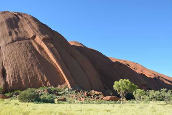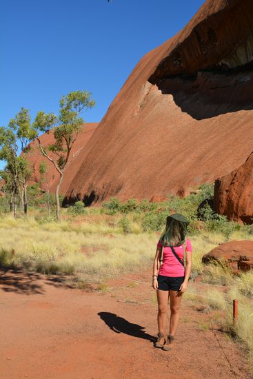 Wir begannen um 7.30 Uhr den 10.5km langen Uluru Base Walk. Der Weg führte uns teilweise direkt am Fels entlang, aber manchmal auch etwas weiter entfernt, sodass man einen guten Überblick über die direkte Umgebung und die Beschaffenheit des Felsens bekommt. Noch einmal würden wir den Basewalk allerdings nicht machen, denn auf Dauer wiederholt sich die Landschaft oft. Man hat immer auf einer Seite den Uluru und auf der anderen Graslandschaft und da auch der Weg komplett eben ist, wird das Ganze schnell langweilig. Alternativ könnte man geführte Segway Touren für 140$ machen oder sich für 45$ für drei Stunden ein Fahrrad mieten, wenn man bereit ist so viel Geld dafür auszugeben, um den Uluru zu umrunden . Man kann natürlich auch einfach einen Teil des Wegs gehen oder den kostenlosen, etwa 2 Std. dauernden Ranger Walk machen, während dem man alles mögliche erklärt bekommt. Den Weg entlang stehen aber auch öfters Schilder, die einem die Geschichten zu den heiligen Orten erklären. Es ist auch möglich auf den Uluru hinaufzuklettern, jedoch wird man von den Aboriginies gebeten, das zu unterlassen, weil es für sie ein spirituelle Handlung ist. Seit 1950 sind auch schon über 35 Menschen beim Besteigen des Berges gestorben, denn natürlich gibt es auf dem Weg nach oben keinerlei Schatten und viele Menschen unterschätzen die Anstrengung.