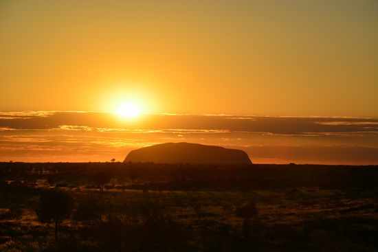 Wir machten uns also wieder im Dunkeln auf den Weg und fuhren die 40Km zu den Katatjuta. Pünktlich zum Sonnenaufgang erreichten wir die Sunrise Platform und ergatterten einen guten Platz. Von dort aus konnten wir die gesamte Felsfront sehen und die vielen einzelnen Kuppeln. Das Highlight beim Sonnenaufgang war jedoch wieder der Uluru, denn direkt hinter ihm geht die Sonne auf, so dass man nur die schwarze Silhouette vor der aufgehenden Sonne sieht. Das Licht fällt deshalb recht spät auf die Katatjuta und die Farben sind zu dieser Tageszeit noch nicht besonders beeindruckend. Kurz nachdem die Sonne ganz hinter dem Uluru hervor gekommen war, fuhren wir zum Parkplatz, von dem der Walk losgeht. Wir dachten eigentlich, dass dort eher wenige Menschen sind, aber es waren schon zwei Busse vor uns da.