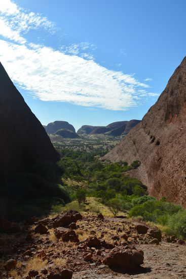 Vom zweiten Lookout schaut man zwischen zwei Felsen hindurch auf ein wunderschönes, mit gelbem Gras bewachsenes, Tal. An diesem Punkt kann man sich überlegen, ob man den gleichen Weg zurück geht, oder den 2 km längeren Rundweg durch das Tal machen möchte. Wir entschieden uns für den Rundweg und wurden mit einigen schönen Aussichten über die weite Ebene belohnt, die die Katatjuta und den Uluru umgibt.