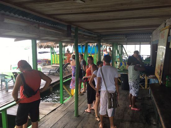 Wir stoppen an der Insel, wo wir später Lunch einnehmen. Jetzt stoppen wir um zu bestellen.Hier ist Touristimmung mit Musik und einer netten Bar