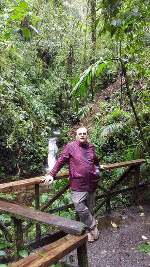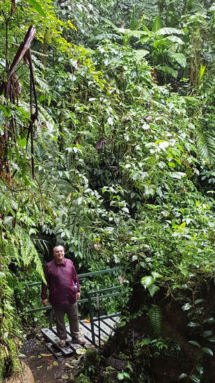 Auch diese Strasse ist eigentlich gut, aber immer wieder muessen wir ganz tiefen Schlagloechern ausweichen, da wuerden wir sonst glatt stecken bleiben. Es ist schon dunkel, als wir in La Fortuna ankommen. Wir buchen uns im "Hotel Vista del Cerro" ein. Vom Zimmer hat man Blick auf den Arenal, aber es ist wieder zu diesig. Ich hoffe morgen sehen wir etwas.