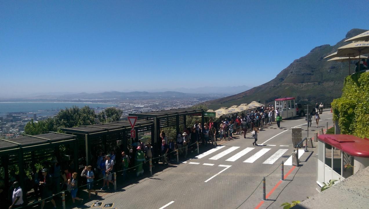 Von Muizenberg über Nordhoek an die Westküste gelangt, eine der Traumstraßen der Welt, den Chapmans Peak Drive, befahren, über die M63 zur Table mountain road gelangt und ein Plätzchen zum Parken gefunden, war noch ein Stück zu laufen, aber das gehört dazu. Auf Hinweis unserer Vermieterin Onlinetickets geordert, weil es 2 Schlangen gibt, für Ticketinhaber und für Ticketkäufer. Unsere war ein wenig kürzer, aber 1:15 h waren es trotzdem.
