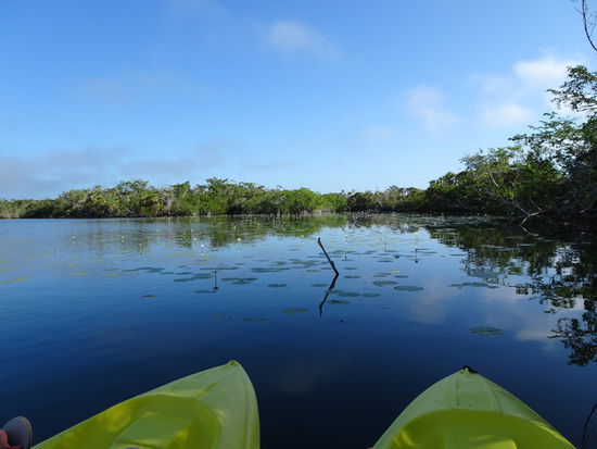 Gleich früh am Morgen nach einem Kaffee lassen wir die beiden Kajaks zu Wasser und paddeln über die Lagune. Das Wasser ist kristallklar und wir sind allein mit den paar Fischen unter uns und den Vögeln, die über uns dahin fliegen. Ein Naturparadies wie es schöner kaum sein kann. Am Resort Hotel entern wir das Wifi und lesen, dass unser Warmshower aus Filipe Carrillo Puerto geantwortet hat, wir könnten kommen. Also satteln wir mittags dir Räder und strampeln in der Glut los. Zwischendurch eine kurze Erfrischung: einer der plötzlichen Regenschauer duscht uns ab. Luftfeuchte gefühlte 110 % bei 36 °C. Schwitz!
