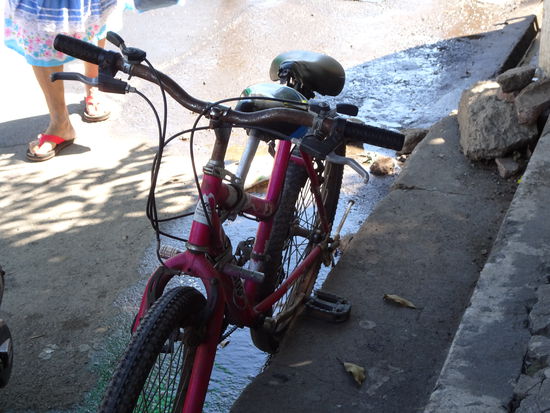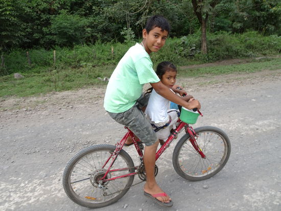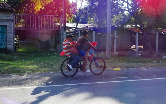 Unserer heutiges Ziel ist es, so weit wie möglich an die Grenze zu kommen, aber nochmal in El Salvador zu übernachten. Die letzten Tage war es auch schwierig, eine Internetverbindung oder einfach einen Supermarkt zu finden. Straßenstände mit Pupusas oder Tortillas gibt es zwar überall, aber Müsli und Kaffee sind alle. Also biegen wir ab nach Acajutla, "kaufen" in einem Restaurant den WLAN Schlüssel und aktualisieren den blog. Im Markt bekommen wir alles Gewünschte und in einem Comedor, bei einem kleinen privaten Speiseanbieter, Fischsuppe und gebratenen Fisch. Die weiblichen Familienmitglieder betreiben diese Verpflegungsstellen gemeinsam, man hat meist zwei oder drei Gerichte zur Auswahl oder guckt einfach in die Töpfe. (2 Frauen formen und backen die Tortillas, zwei kochen, die größeren Kinder servieren oder fahren mit dem Rad Essen zur Kundschaft oder holen Nachschub an Gemüse.) Fahrräder sind allgegenwärtig. Schon kleine Kinder fahren allein auf der Straße, oft mit Säcken, Teigschüsseln oder Geschwistern auf der Querstange. Erwachsene transportieren die erstaunlichsten Dinge: ein oder zwei andere Personen, bis zu drei 20l Gasflaschen, 30l Eimer Molke, 50kg Maissäcke,... die Räder scheinen stabil zu sein.