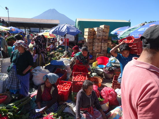 Im Hintergrund grüßen uns die Vulkane Fuego y Agua (Feuer und Wasser) Der Vulkan Agua ist nicht mehr aktiv, dafür aber der Vulkan Fuego, der bei gutem Wetter rote Lava erkennen lässt.