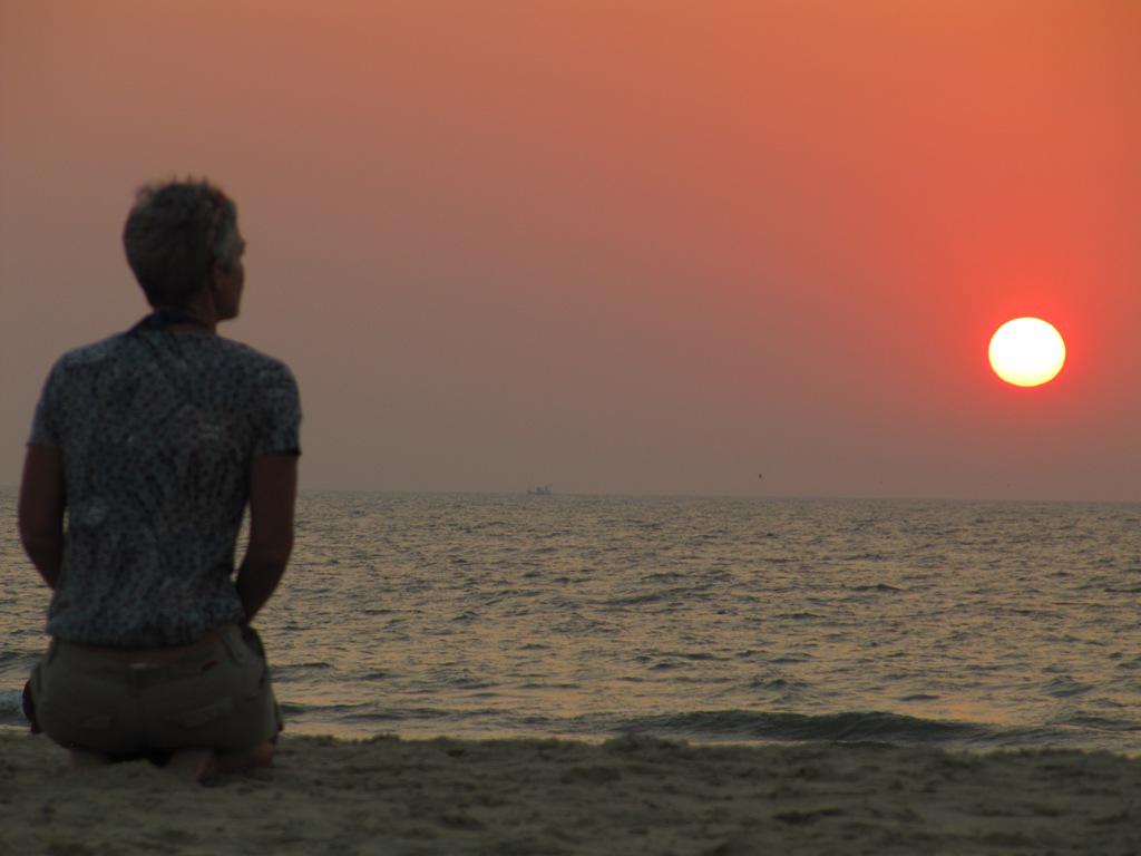 Weiter Sandstrand am arabischen Meer, 33 Grad. Morgens wird es früh sehr heiß. Eine weiß-glühende Sonne steigt auf. Gegen Nachmittag dann eine kühle Briese vom Meer. 6 Uhr Sonnenuntergang. Dann ganz schnell stockdunkel.