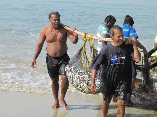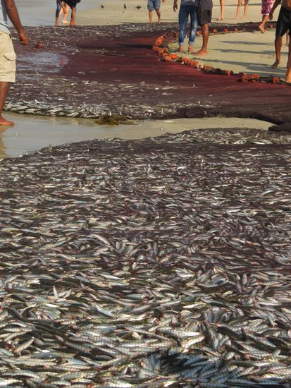 Am frühen Morgen landen sie am Strand, es ist erstaunlich, welche Hänflinge hier zum Teil schwere Arbeit leisten. Das Einholen der Netze ist enorm schwer, geschieht auch nicht ohne das nötige Geschrei, sei es der unterschiedlichen Kommandos wegen, um weitere Leute zur Hilfe zu animieren oder auch ein wenig um Aufsehen zu erregen? Liegen die zuletzt gesehenen vollen Netze dann an Land, wird verteilt. Hier tauchen dann auch einige Frauen mit Körben auf, denn ihre Aufgabe ist die Weiterverarbeitung des Fisches. Dies kann das Braten der einen Mahlzeit sein, was aber hier in weitaus umfangreicherem Stile gemacht wird ist, die Fische in Körbe zu laden, diese ein Stück des Weges zu schleppen und dann auf kleinen Hockern oder der Straße sitzend jeden einzelnen Fisch mit den Fingern auszunehmen. Anschließend werden sie ausgelegt, mehrmals gewendet, um dann schlußendlich mit Salz versehen getrocknet in Körbe zu lagern, um dann auf dem Markt verkauft zu werden. Diese in gebückter Haltung, in der prallen Sonne bei elendem Gestank stattfindende Arbeit wird natürlich in erster Linie von Frauen durchgeführt. Und dabei lassen sie sich nicht gerne fotografieren!
