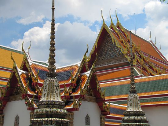 Wat Pho im Zentrum der historischen Altstadt von Bangkok. Weithin sichtbar durch die vier Chedis, eine jede 42 Meter hoch und mit verschiedenfarbigen Mosaiken aus Kacheln bedeckt.
