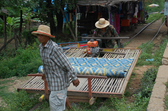 Der Spass kostet 5 US$ pro Person. Man sitzt auf Kissen auf der Bambusplatte, ein alter Motor als Antrieb und 2 Achsen mit Rollen unten drunter.
