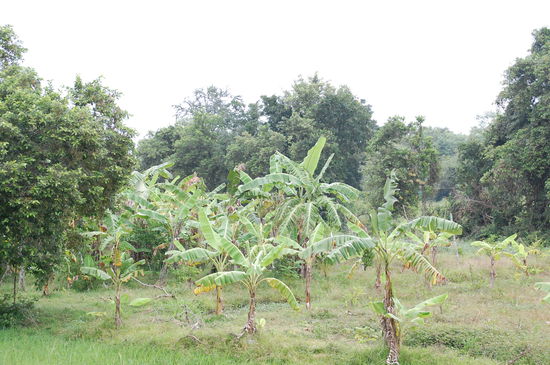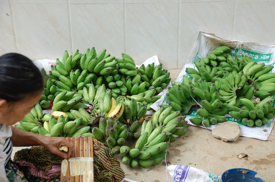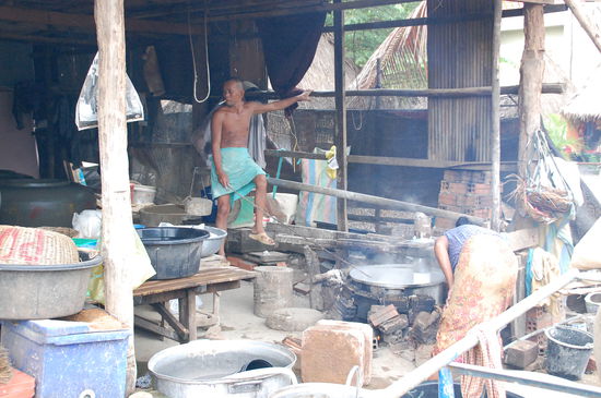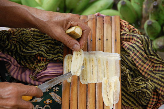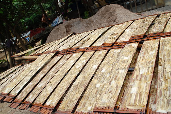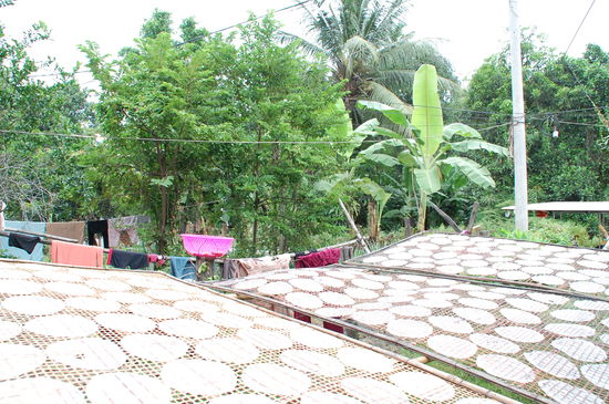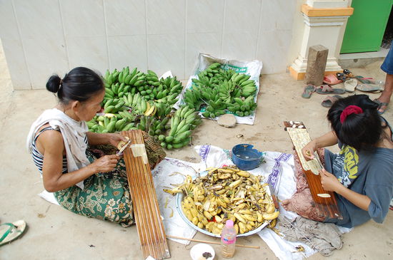 Gleich im Anschluss kommt dann die Gegend, in denen Bananenchips "hergestellt" werden. Bananen (übrigens bei uns sind das die Minibananen) werden hauchdünn mit dem Messer geschnitten und zum Trocknen auf Bambusmatten ausgelegt. Wenn man allerdings die Trilliarden von Fliegen darauf sieht (solange sie noch nicht getrocknet sind) vergeht einem doch der Appetit darauf