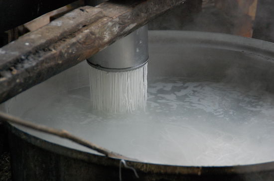 Grob zusammengefasst, wird der Reis zu Reismehl verarbeitet, dann mit Wasser zu einer "Reismilch" verkocht, die wird eingedickt und dann wird diese feste Masse durch ein Sieb ins kochende Wasser gedrückt. Dann kommen die ins eiskalte Wasser und werden dann für den Verkauf weiter verarbeitet.
