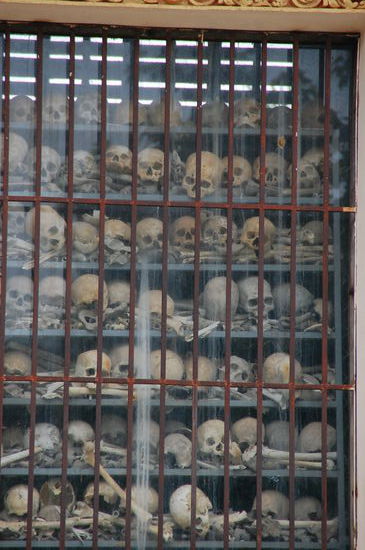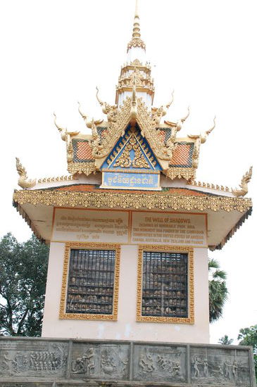 Jetzt hat uns der Fahrer zu einem Denkmal "Killing Field" für Opfer des Khmer-Regimes gefahren. Hier in Battambang sind 10.008 Leute ums Leben gekommen, deren Schädel immer noch hier aufbewahrt sind