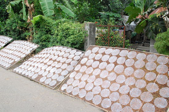 Jetzt kommen wir so langsam in die Gegend, wo Reispapier (zum Einwickeln von Frühlingsrollen) hergestellt wird. Leider finden wir keinen Stand, wo noch gearbeitet wird. Da das Wetter nicht ganz trocken ist und (zum Glück für uns) die Sonne nicht scheint, können die Reispapierfladen nicht zum Trocknen aufgestellt werden. Es gibt zwar einige Bambusmatten mit Reispapier zum Trocknen, aber man kann sehen, daß es lange dauert, bis sie trocken werden.