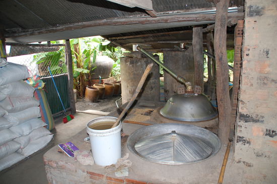 Als nächstes haben wir eine Bude angefahren, in der Reisschnaps gebrannt wird. Hierzu wird der Reis, es wird sogenannter "Bruchreis", also das Billigste vom Billigen verwendet, mit Wasser aufgequollen und dann wieder getrocknet. Und dann mit verschiedenen Zutaten zu Schnaps mit verschiedenen Geschmacksrichtungen gebrannt. Natürlich gab es auch eine Kostprobe