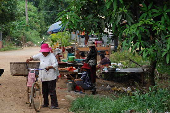 Dann haben wir an einem Stand gehalten, hier wird Sticky Rice, ein Dessert verkauft. Es wird Reis mit Kokosmilch und schwarzen Bohnen zu einem Brei verarbeitet und in den Bamusrohren langsam erhitzt. Haben wir aber nicht probiert. Hier habe ich wieder Mini-Gummibärchen Tüten verteilt, dann bin ich hier echt der King. Die Kinder bedanken sich aber immer sehr höflich.