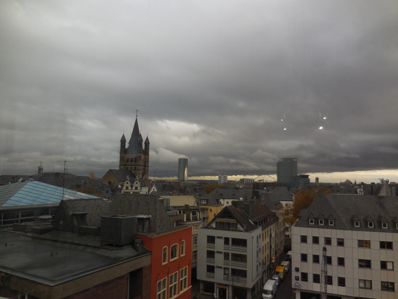 es gibt einen Aussichtsbalkon mit toller Kulisse. Man sieht allerdings die sehr tief hängenden, dicken Regenwolken... der Silberstreif am Horizont wird heute im Zentrum Kölns allerdings leider nicht ankommen...