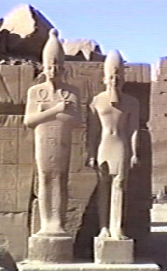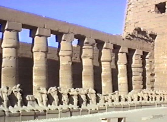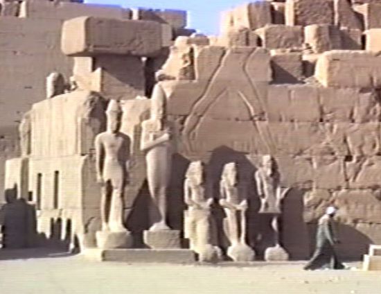 Die Herrscher der 12. Dynastie begannen mit den ersten Arbeilen zum Bau des Großer Amon -Tempels. Im Verlauf von Generationen wurde er immer größer und prächtiger erweitert, ausgebaut und geschmückt, so daß schließlich der Amon-Tempel eine Anzahl weiterer Heiligtümer miteinbezog. Deshalb konnte die Anlage wegen der ständigen Ein- und Umbauten nicht einheitlich bleiben. Sie vermittelt uns heute ägyptische Kunst verschiedenster Zeitfolgen. Gebaut wurde der Tempel von Thutmosis I., Hatschepsut, Thutmosis III., Amenophis III., Ramses L, Setos /., Ramses II., Seros IL, Ramses III., den Königen von Bubaslis, Taharka und den Ptolemäern.