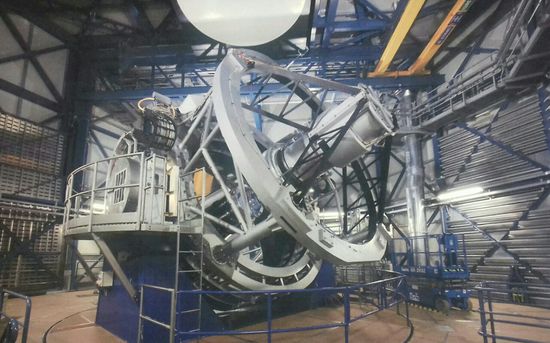 Das VLT (Very Large Telescope) kombiniert vier Spiegel von je 8,20 m Durchmesser sowie drei kleinere und simuliert so die optische Auflösung eines 200-Meter-Teleskops.