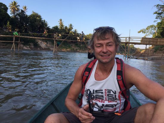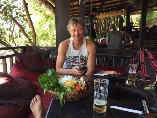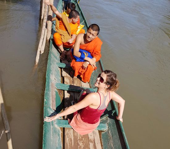 Heute brauche ich einen Tag Erholung, das Fieber ist wieder runter, die Gliederschmerzen sind weg und auch der Magen nimmt die Pancake mit Schokosoße zum Frühstück gut an. Trotzdem wollen wir den Tag ruhig angehen lassen und gammeln bis fast 13:00Uhr auf der Terrasse vor dem Haus im Halbschatten. Den Nachmittag wollen wir aber nicht in unserem Guesthouse verbringen und machen uns auf den Weg zum Dyen Sabai ein schönes Restaurant auf der anderen Seite des Flusses. Mit drei Mönchen im Boot überqueren wir mit einem Longtailboot den strömenden Fluss, dank des göttlichen Beistands kamen wir gut auf der anderen Seite an.