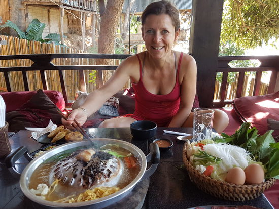 Da Anja eine leidenschaftliche Fondue und Heißerstein Liebhaberin ist, werde ich gezwungen mich anzupassen und es wird ein Hotpot bestellt, der hier in Luang Prabang als Spezialität gilt (siehe Bild).