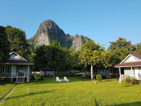 Endlich: nach nur sieben (statt vier bis fünf) Stunden komme wir am Busbahnhof von VangVieng an. Wie immer stürzen die Tuktuk Fahrer auf einen zu. Eigentlich wollte uns jemand von unserem Guesthouse abholen. Als jemand mit der entsprechenden Visitenkarte auf uns zukommt, glauben wir uns gut aufgehoben. Missverständnis, wie wir später merken. Wir tuckern also Richtung Zentrum, bemerken nicht zum ersten Mal an diesem Tag, dass wir den Altersdurchschnitt erheblich anheben. Diese Tatsache ignorieren wir konsequent was soll man denn auch antworten, wenn man von einer übergewichtigen Backpackerin gefragt wird, ob wir WIRKLICH vorhaben „Tubing“ zu machen. Aus der Patsche hilft ein tätowierter Engländer/oder Amerikaner der sagt: For good fun we are never too old.“ Aber vielleicht sind wir doch zu alt für diesen Ort? So zumindest der erste eher schlimme Eindruck. Überall Backpacker, bunte Bars, die mit billigen Cocktails & Co werben und schmuddelig-staubigen Straßen.