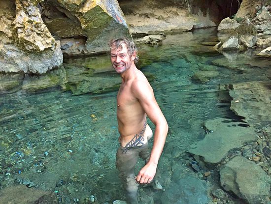Asphaltiert geht es los und wir besuchen nach nicht mal einem km die erste kleine Höhle und ich nutze die Einsamkeit der Lagune und gehe nackt baden.
