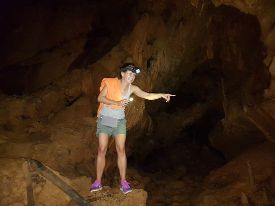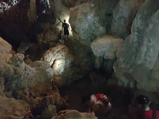 Wir lassen das Treiben schnell hinter uns und gehen zum Einstieg in die 50 Meter höher gelegene Höhle Tham Phu Kam. Zum Glück ist eine Gruppe von Polen vor uns, die ebenfalls so wie wir Kopflampen aus dem Verleih hatten, denn es geht locker 10min in die Dunkelheit. Immer wieder streift unser Lichtkegel das ein oder andere Schild mit einem Totenkopf drauf, was in großen Löchern im Boden steckt und anzeigt das es hier lebensgefährliche Durchbrüche in den Untergrund gibt. Auch sonst ist der Weg nicht groß gekennzeichnet und man musste viel klettern, sich durch Spalten schieben und die dicken Höhlenspinnen taten ihr übriges, dass das ganze zum Abenteuer wird. Sowas ist in Europa undenkbar, aber dank Asien wird man hier beileibe noch zum unfreiwilligen Höhlenforscher.