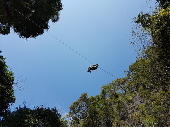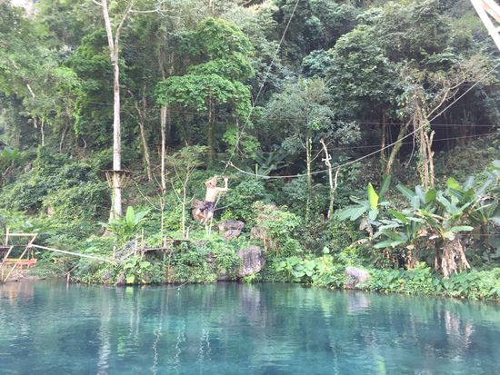 Erfrischt geht es weiter zur Blue Lagune 1 hier kommen wir uns das erste mal vor wie am Badesee zur Hochsaison. Scharen tummeln sich um die Lagune, eine Zipline rauscht aus den Baumwipfeln über uns, eine Wasserrutsche mündet im Becken, von Bäumen hängen Seile und der ein oder andere Koreaner springt im Volldress vom Baum… irgendwie verrückt.
