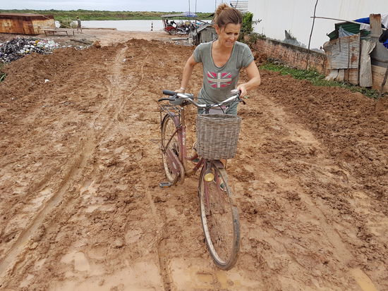 Stattdessen schnappen wir uns die Hollandräder und fahren die 10km Richtung TonleSap See um vielleicht eins der schwimmenden Dörfer zu besuchen. Kaum einen km gefahren setzt der Regen wieder ein und in Phasen müssen wir uns immer wieder unterstellen um nicht patschnass zu werden.
