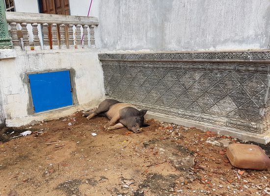 Vor der Tür steht ein Schweizer mit einem Lokal und schauen durch die Gegend, plötzlich spricht der Kambodschaner uns an und fragt ob wir Lust auf eine private Bootstour zu den Dörfern haben. Ich biete 10$ pro Person und der Preis scheint ok, jetzt fehlt uns nur noch das Boot. Gemeinsam fahren wir am Fluss entlang und hier und da spricht er mal einen Einheimischen an ob er sich ein Boot mieten kann. So pöapö verlieren wir das Vertrauen in den Kerl und melden uns ab. Stattdessen besteigen wir den um die Ecke befindlichen Phnom Krom, der einzige kleine Hügel weit und breit. Mit 100 Metern anscheinen hoch genug um einen Tempel drauf zu bauen. Der anfängliche Treppenaufstieg und fortlaufende Weg machen einen usseligen Eindruck, hoffentlich wird das besser, aber als wir oben ankommen und uns eine fette Sau gunzent begrüßt, wissen wir, dass es auch asiatische Messis gibt.