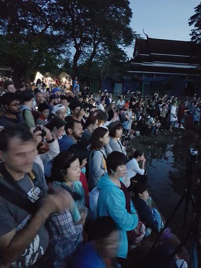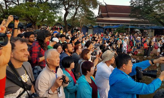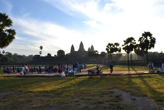 Um 05:00Uhr stehen wir mit einer Masse an kameraausgerüsteten Mitstreitern vor dem kleinen See in ca. 200 Metern zum Tempelkomplex. Die Chinesen und Koreaner bilden die erste Front, ich glaube die haben hier übernachtet. Mit Plastikstühlen, Stativen und Objektiven die so groß und lang sind das man sie als mobiles Observatorium bezeichnen könnte, sichern sie die erste Reihe. Danach dürfen die Europäer mit ihren durchschnittlichen Kameras und Handys in Stellung gehen. Ab Reihe 5 wird es dann wieder entspannter und ich sehe Anja hinter mir wie sie sich das Menschen Spektakel mit einem Lächeln amüsiert von hinten betrachtet.