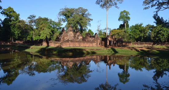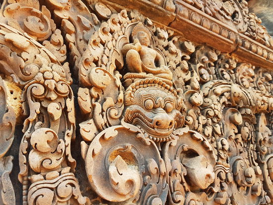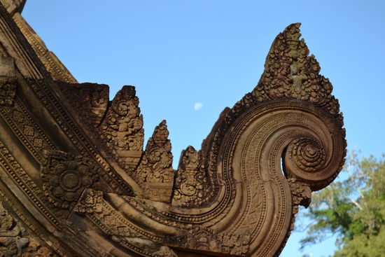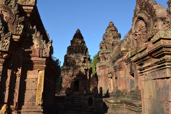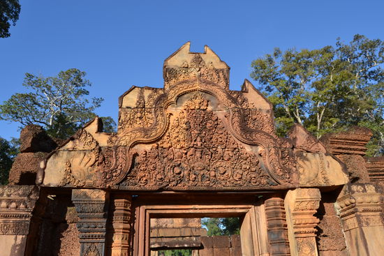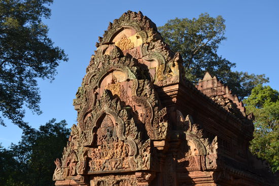 Da wir um kurz nach 7 schon wieder im Tuktuk sitzen, machen wir uns auf den Weg zum 41km entfernten Banteay Srei Tempel, der wegen seiner filigranen Steinmetzarbeiten zu einem weiteren Highlight des Angkorkomplexes zählt. Der Tempel ist recht klein und wir haben Glück das wir im Moment so früh und nur mit wenigen Touristen Vorort unterwegs sind. Auf dem Rückweg sieht man schon die großen Reisebusse anrollen und man kann sich vorstellen wie es gleich wieder im Tempel voll wird.