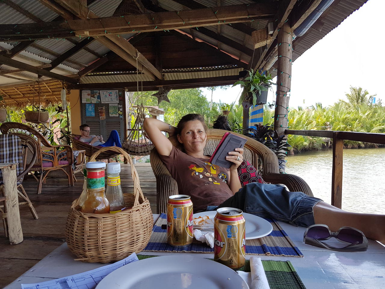 Da wir schon zur Mittagszeit da sind, nutzen wir das Angebot unseres Franzosen mit einem SUP die Wasserwege zu erkunden. Die STARBOARDS sind in einem einwandfreien Zustand und quasi neu. Dazu gab es Carbonpaddel und eine Einweisung von Anja, die sich mit dem Thema schon gut auskennt. Ich glaube es gibt kaum einen schöneren Einstieg in diese Sportart, über schmale gewundene Wasserwege geht es durch den Halbdschungel. Danach geht es in den großen Fluss der kaum Strömung hat, bis zum südlichen Zipfel der Stadt und dann wieder alles zurück. Es ist ein toller Ausflug.