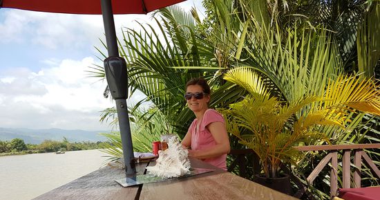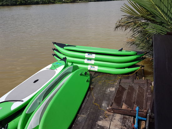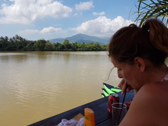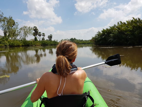 Der heutige Tag steht unter dem Motto Kajak und Rollertour, Unser Bungalowbesitzer Simon hat uns diese Tour empfohlen, es geht mit unserem 100er Roller den Fluss entlang Richtung Norden, kurz nach dem Ortsausgang geht es auf unasphaltierten Straßen weiter. Die rote Tonerde hat schön das ganze Wasser vom Vortag gesammelt und riesige Schlammpfützen in den Weg gezaubert. Es grenzt an ein motorisiertes Querfeldeinrennen, denn es ist gut was los auf dem Feldweg und jeder versucht irgendwie möglichst wenig Schlamm mitzunehmen. Wir fahren bis zum “Checkpoint“, eine kleine deutsche Bungalowanlage in der Flussbiegung. Die Anlage lädt auf ein Bier ein und außerdem hat Manni tolle Kajaks aus China importiert. Wir mieten uns einen 2er und paddeln in einen schönen Nebenarm, der als Loop 1h später und 30 Meter weiter unten wieder im Hautstrom endet. Anja nennt die Tour mentales Paddeln, weil wir wenig gesprochen haben und das stille und stetige paddeln etwas beruhigendes hat... Es gefällt uns super.