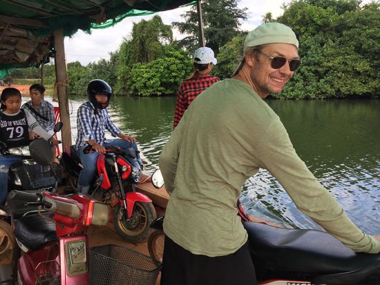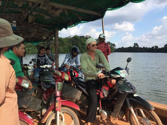 Nach einem leckeren Mittagessen mit Loklak und Amok (kambodschianische Nationalgerichte) geht es mit dem Roller weiter Richtung Fähre, laut meinem GPS gibt es hier eigentlich keine Wege mehr, aber wir vertrauen auf Simon. Nach 2-3 unsicheren Km haben wir tatsächlich die kleine Fähre gefunden. Ab hier geht es zum Glück wieder über befestigte Straßen zurück nach Kampot.