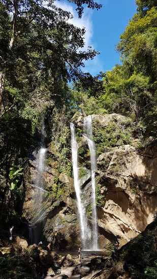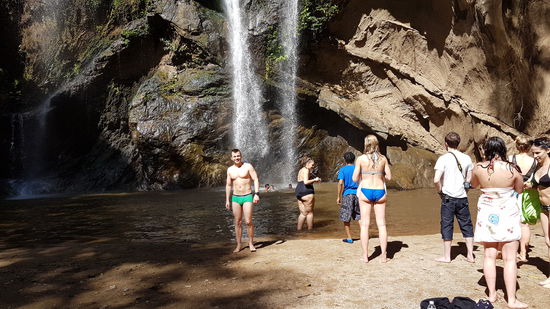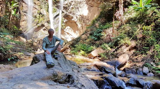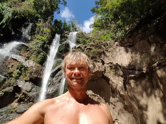 Unser erster Zwischenstopp ist der Mork Fa Wasserfall, nur 3km abseits unserer Haupstrecke. Da es schon ordentlich warm ist, springt Daniel erstmal in die Lagune ins erfrischende Nass.