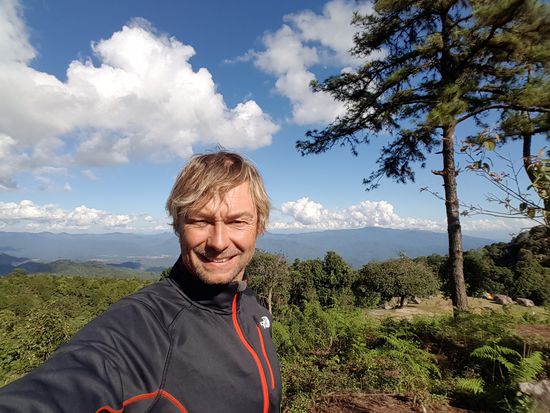 Der nächste Abstecher ist einfach nur zu einem Aussichtspunkt am höchsten Punkt unserer Etappe auf 1718 Metern. Von hier aus hat man einen phantastischen Rundumblick, bis zum 30km entfernten Berg Doi Chiang Dao mit 2175 Metern.